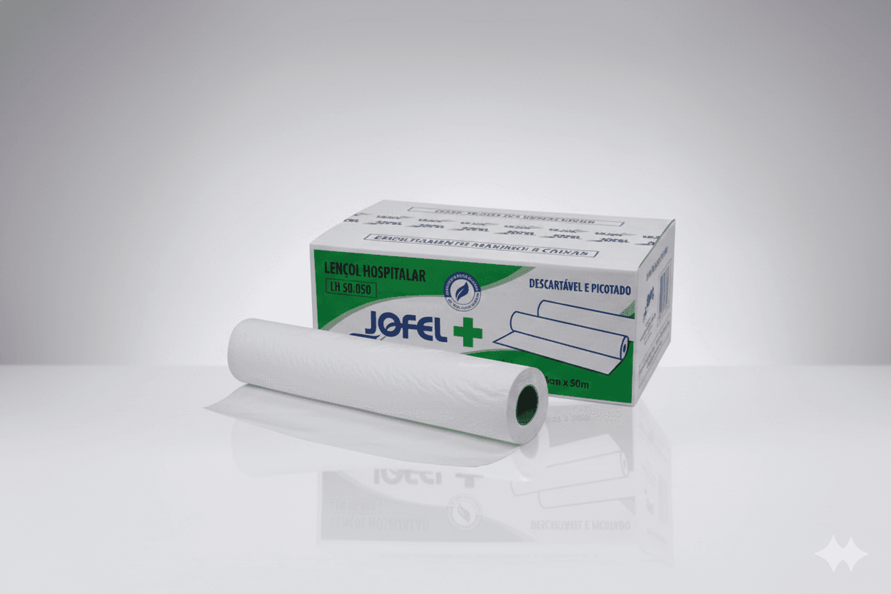 Lençol hospitalar descartável, gofrado e picotado, com rolos embalados individualmente.