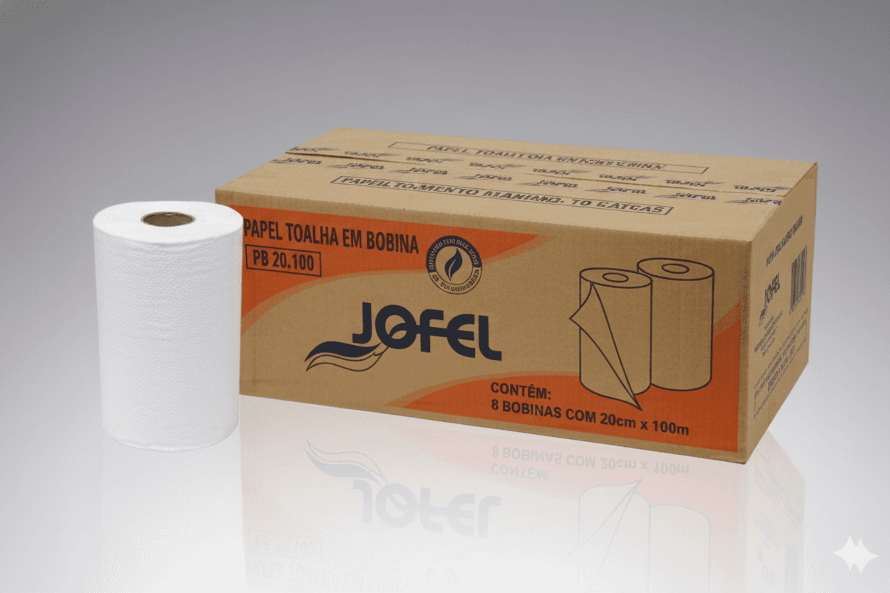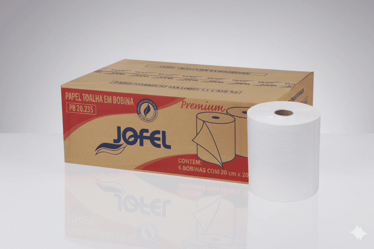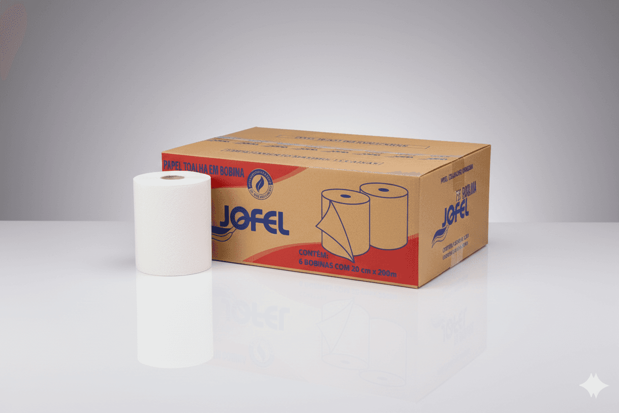 Papel toalha em bobina de alta metragem, ideal para ambientes de grande circulação.