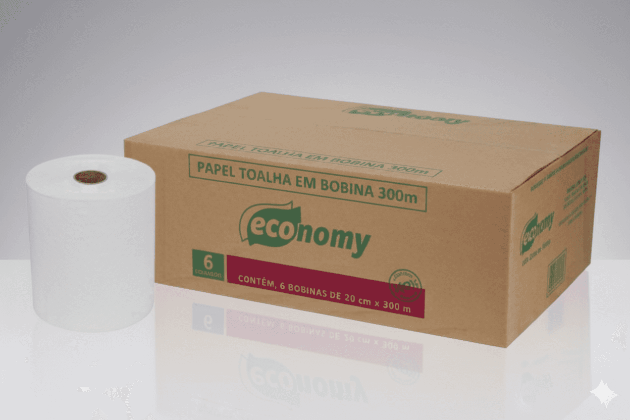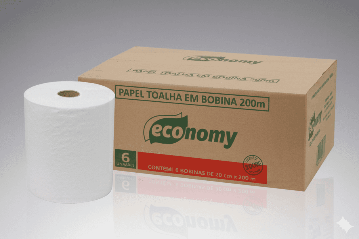 Papel toalha em bobina, econômico e resistente. Indicado para alto consumo.