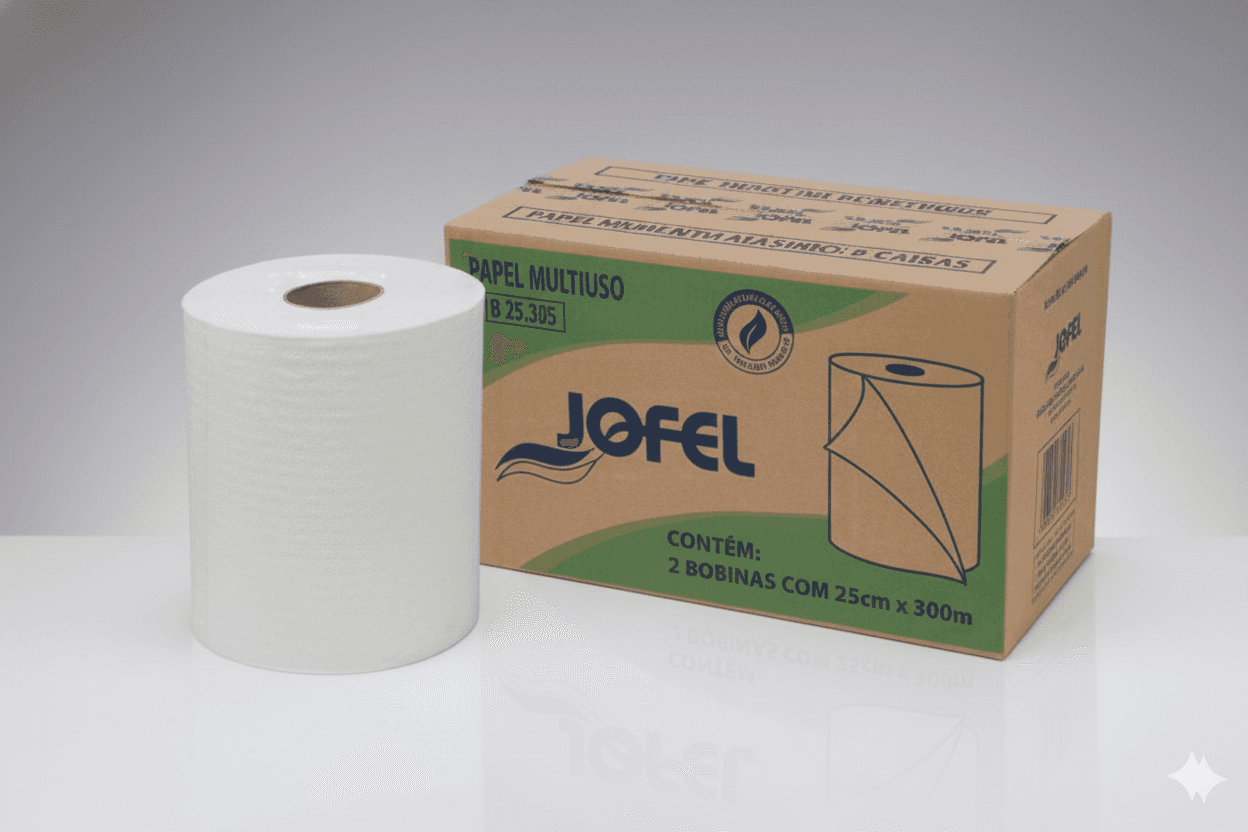 Papel multiuso em bobina, resistente e versátil para limpezas em geral.